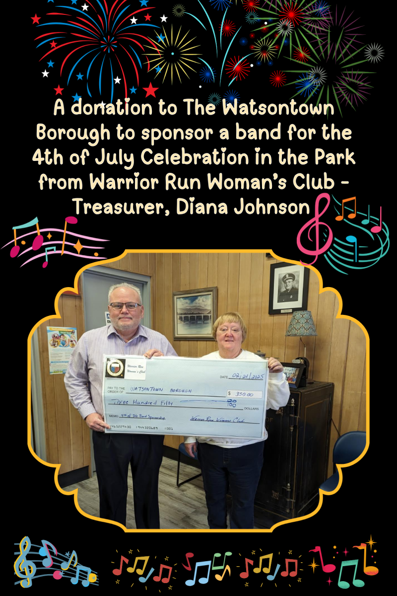 Warrior Run Area Fire Department Fire Chief, Doug Funk, accepts donations from WRWC treasurer, Diana Johnson. We are proud to support our local fire company!